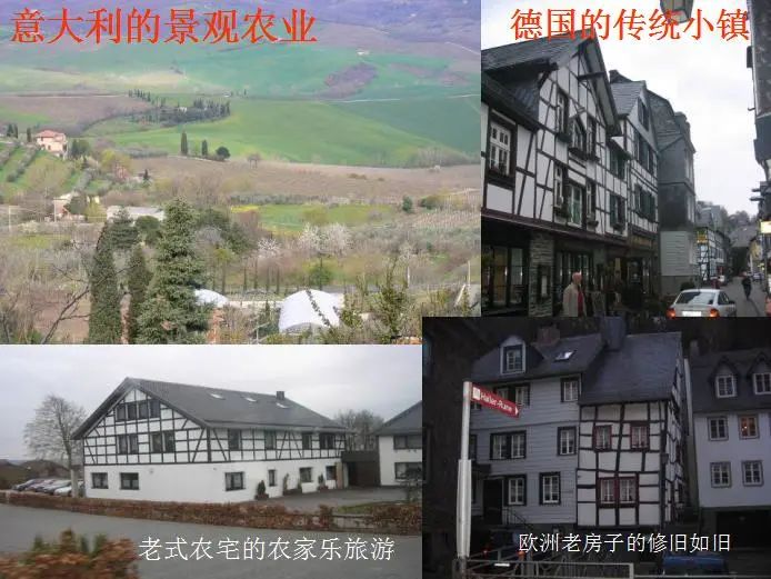 請看這個石片片的門,木板房,這是位于山區的四星級酒店,為啥四星級呢?推開門就是山區景觀。我在德國被人家請去做交流,特意安排我到鄉村住這種四星級,早晨推開木窗,牛在你的窗下吃草,那個感覺是不一樣的。現在城里人高度緊張,得精神疾病的比比皆是,他怎么洗心呢?他得到鄉村來住幾天。我們現在越來越強調要休假,休假上哪兒去?到鄉村去,而不是在城里住賓館,鄉村的四星級賓館就是因為你有景觀。什么叫做景觀農業?就是因為你有了景觀,你的農業才值錢,這個道理一定要跟大家反復強調。