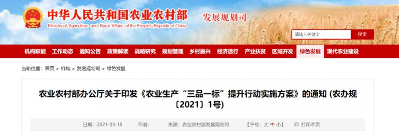 為深入貫徹落實中央農村工作會議、2021年中央一號文件精神,我部決定實施農業生產“三品一標”提升行動,推進品種培優、品質提升、品牌打造和標準化生產,引領農業綠色發展,提升農業質量效益和競爭力。現將《農業生產“三品一標”提升行動實施方案》印發你們,請結合實際,抓好落實。