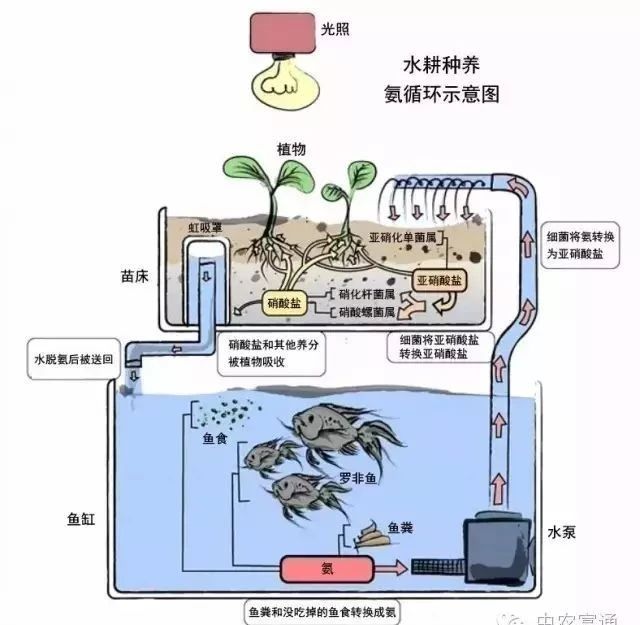 魚(yú)菜共生(Aquaponics)是一種新型的復(fù)合耕作體系,它把水產(chǎn)養(yǎng)殖(Aquaculture)與水耕栽培(Hydroponics)這兩種原本完全不同的農(nóng)耕技術(shù),通過(guò)巧妙的生態(tài)設(shè)計(jì),達(dá)到科學(xué)的協(xié)同共生,從而實(shí)現(xiàn)養(yǎng)魚(yú)不換水而無(wú)水質(zhì)憂患,種菜不施肥而菜能正常生長(zhǎng)的生態(tài)共生效應(yīng)。在傳統(tǒng)的水產(chǎn)養(yǎng)殖中,隨著魚(yú)的排泄物積累,水體的氨氮增加,毒性逐步增大。而在魚(yú)菜共生系統(tǒng)中,水產(chǎn)養(yǎng)殖的水被運(yùn)輸?shù)剿嘣耘嘞到y(tǒng),由細(xì)菌將水中的氨氮分解成亞硝酸鹽然后被硝化細(xì)菌分解成硝酸鹽,硝酸鹽可以直接被植物作為營(yíng)養(yǎng)吸收利用。魚(yú)菜共生系統(tǒng)讓動(dòng)物、植物、微生物三者之間達(dá)到一種和諧的生態(tài)平衡關(guān)系,是可持續(xù)循環(huán)型零排放的低碳生產(chǎn)模式,也是有效解決農(nóng)業(yè)生態(tài)危機(jī)的創(chuàng)新方法。