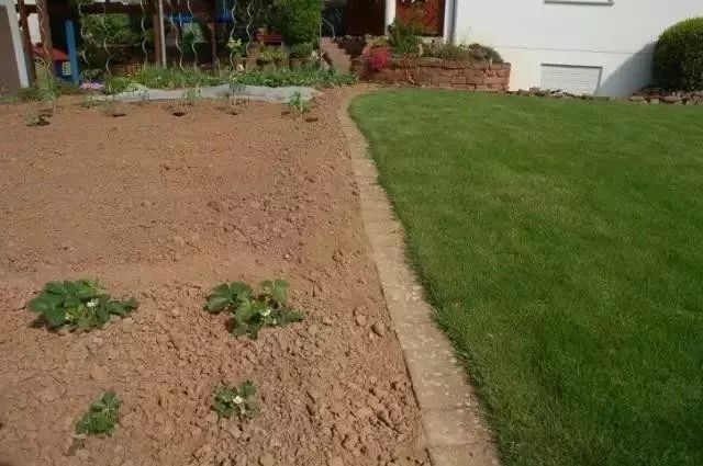 這家人比較會享受:一半草地,剪得很平,另一半,用來種花和草莓。