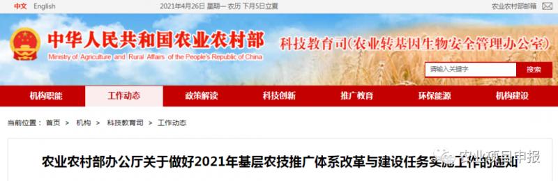 近日,根據農業農村部、財政部關于做好2021年農業生產發展等項目實施工作的通知要求,農業農村部印發《關于做好2021年基層農技推廣體系改革與建設任務實施工作的通知》;