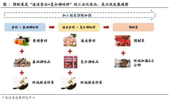 預制菜指食材和調味料在工廠完成烹飪加工,消費者買回家入鍋蒸煮2-3分鐘即可完成的一道菜。預制菜加工程度較速凍半成品和復合調味料更高,餐飲端降低成本、提升效率、簡化家庭端烹飪過程效果更明顯,是必然發展趨勢。
