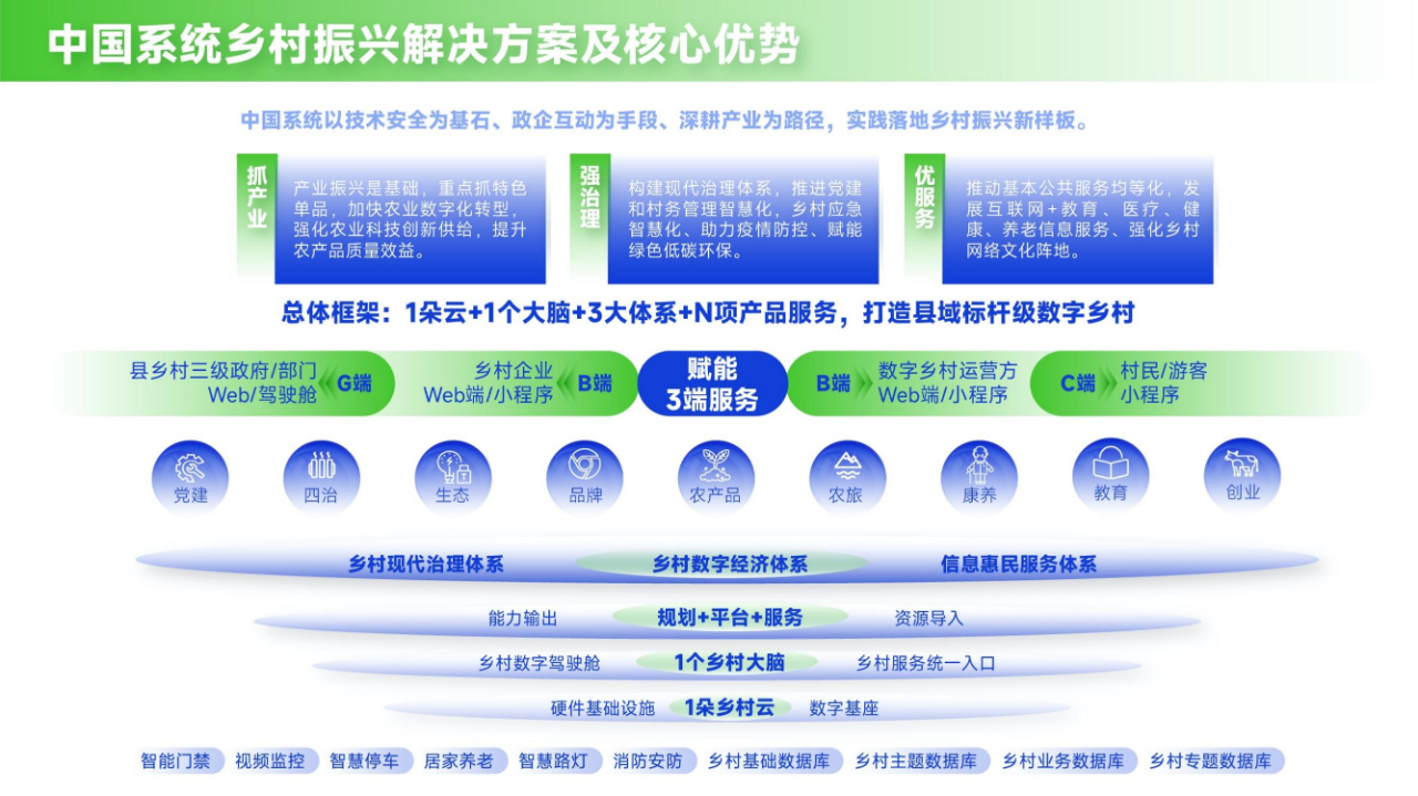 透視發現,中國系統的鄉村振興方案主要面向村鎮數字化鄉村建設和面向縣域農業產業集群轉型提升兩大業務模塊,分別構建未來鄉村和特色產業。在未來鄉村業務上形成數字鄉村大腦、數字體驗中心、數字場景應用;而在特色產業賦能上,中國系統構建了農業大腦、農業應用平臺、鄉村服務產業,以完整的、系統性的建設方案、服務方案,助力農業農村“村美”“民富”“產業興”。