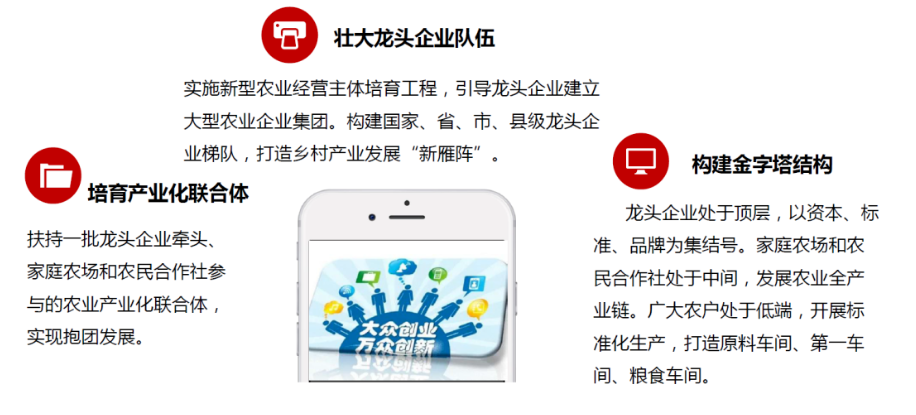 (三)健全農(nóng)業(yè)產(chǎn)業(yè)經(jīng)營(yíng)組織體系。發(fā)揮龍頭企業(yè)在開拓市場(chǎng)、品牌營(yíng)銷等方面的優(yōu)勢(shì)。發(fā)揮農(nóng)民合作社在生產(chǎn)組織、農(nóng)資采購(gòu)、技術(shù)指導(dǎo)等方面的優(yōu)勢(shì),支持發(fā)展訂單農(nóng)業(yè)。發(fā)揮家庭農(nóng)場(chǎng)、農(nóng)戶在家庭經(jīng)營(yíng)生產(chǎn)方面的優(yōu)勢(shì),支持其參與組織化生產(chǎn)。推動(dòng)各類新型農(nóng)業(yè)經(jīng)營(yíng)主體融合發(fā)展,形成差異化競(jìng)爭(zhēng)、功能互補(bǔ)的良好格局。