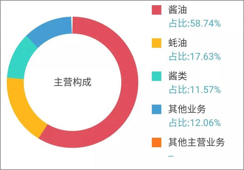 海天最早的產(chǎn)品是醬油,之后又增加了蠔油、調(diào)味醬等產(chǎn)品。2019年,海天味業(yè)營收近200億,其中醬油的收入達(dá)116.28億元,營收占比為58.74%。該公司的三大主要產(chǎn)品為醬油、蠔油、調(diào)味醬,“老三件”合計營收174億,比例高達(dá)87.93%,是一家主業(yè)非常集中的上市公司。