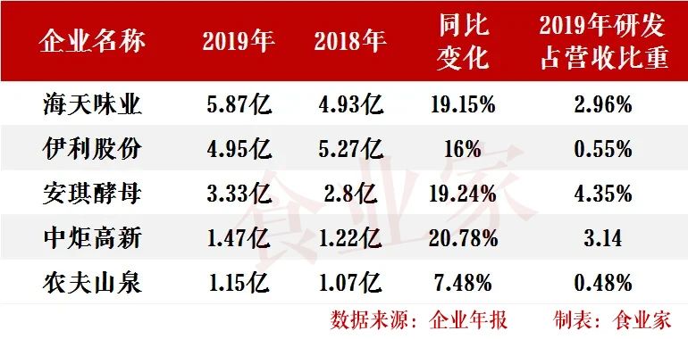 2019年,伊利研發(fā)投入費(fèi)用為4.95億元(占比營收0.55%),僅次于海天的5.87億(占比營收2.96%)。就連以創(chuàng)新見長的農(nóng)夫山泉,2019年研發(fā)投入費(fèi)用也只有1.15億(占比營收0.48%)。