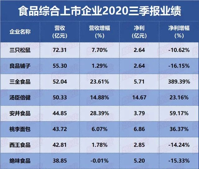 根據(jù)統(tǒng)計,35家食品綜合上市企業(yè)2020前三季度營收總額為811.27億元,較上年同期的767.15億元,增加44.12億元,同比增長5.75%;凈利潤總額為120.07億元,較上年同期的83.62億元,增加36.45億元,同比增長43.59%。