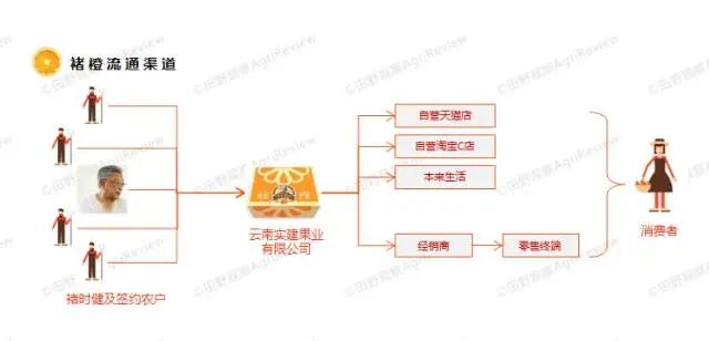 褚橙是統(tǒng)一采收后通過在線上通過天貓?zhí)詫殻页人炫灥辍?shí)建水果專業(yè)店、實(shí)果紀(jì)、褚氏新選旗艦店)和本來生活網(wǎng)銷售,在線下由經(jīng)銷商下發(fā)到各個零售終端銷售。