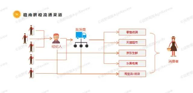 贛南臍橙的流通渠道就復(fù)雜多了。傳統(tǒng)的銷售是從農(nóng)戶到農(nóng)產(chǎn)品經(jīng)紀(jì)人,再經(jīng)過層層的批發(fā)商,最后通過線下零售終端銷售。還有是農(nóng)戶、經(jīng)紀(jì)人或批發(fā)商供貨給電商(天貓、京東或垂直生鮮電商),由電商直營給消費(fèi)者。也有農(nóng)戶或經(jīng)紀(jì)人自己開淘寶店或微店銷售的。