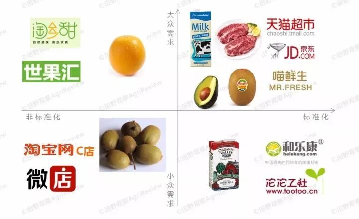第一象限是標(biāo)準(zhǔn)化大眾需求的農(nóng)產(chǎn)品,像上面提到的新奇士橙,澳洲牛排、佳沛奇異果、墨西哥牛油果等。這類產(chǎn)品標(biāo)準(zhǔn)化,消費(fèi)者在哪個渠道購買都一樣,這種情況下,擁有規(guī)模和流量優(yōu)勢的大電商(如天貓超市)自然能夠提供更好的價格和服務(wù)。