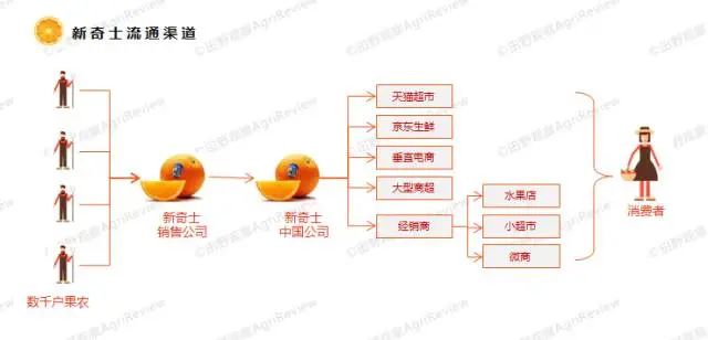 新奇士橙從果農(nóng)統(tǒng)一收購后由新奇士銷售公司運(yùn)往中國公司,然后通過天貓超市、京東生鮮、幾家代理的垂直電商、大型商超直接銷售,或者經(jīng)過經(jīng)銷商再分散到水果店、小超市等銷售(包括微商)。