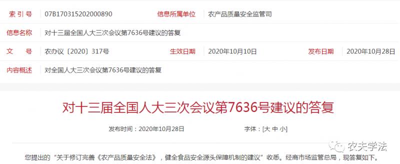 您提出的“關于修訂完善《農產品質量安全法》,健全食品安全源頭保障機制的建議”收悉。經商市場監管總局,現答復如下。