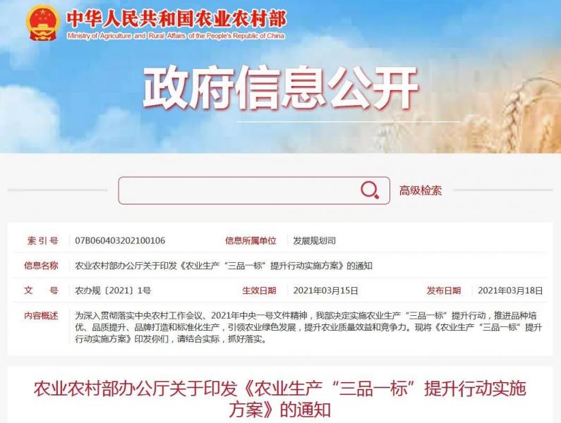 農業農村部網站3月18日公布《農業生產“三品一標”提升行動實施方案》。農業生產“三品一標”,即指“品種培優、品質提升、品牌打造和標準化生產”。