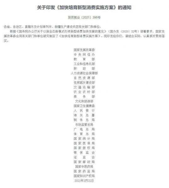 據國家發展改革委網站3月25日消息,根據《國務院辦公廳關于以新業態新模式引領新型消費加快發展的意見》部署要求,國家發展改革委等28部門研究制定了《加快培育新型消費實施方案》,部署了包括培育壯大零售新業態、積極發展“互聯網+醫療健康”、深入發展數字文化和旅游、有序發展在線教育等24項工作。