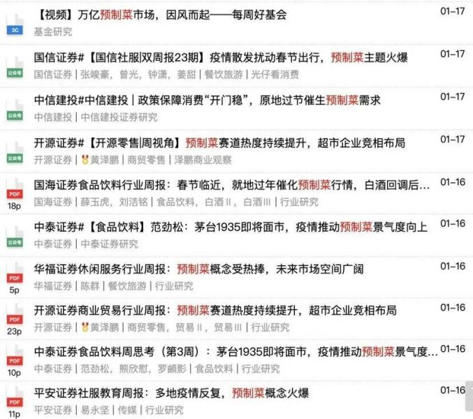 以預制菜為例。Wind數據顯示,2022年以來,題目中含有“預制菜”的券商研報已經有數十篇,報告全文中涉及預制菜內容的研報更是達到了上百篇。在某機構服務平臺上,各券商研究所組織過預制菜主題電話會也有數十場之多。