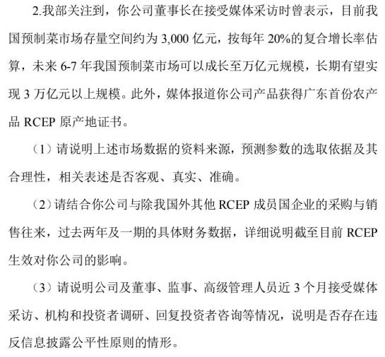 近日,深交所對“預制菜”公司國聯水產下發了關注函,提出國聯水產董事長在接受媒體采訪時曾表示,目前我國預制菜市場存量空間約為3000億元,長期有望實現3萬億元以上規模,請公司說明預測數據依據。