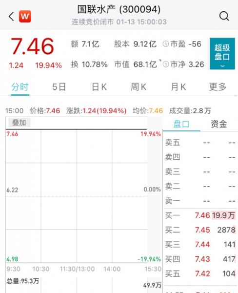 此前,國聯(lián)水產(chǎn)發(fā)布公告稱,與盒馬簽署了合作協(xié)議,雙方將在水產(chǎn)預(yù)制菜品開發(fā)與市場推廣等方面進行深入合作。受消息影響,國聯(lián)水產(chǎn)一連實現(xiàn)2個“20CM”漲停,截至收盤,該股報7.46元,總市值為68.1億元。