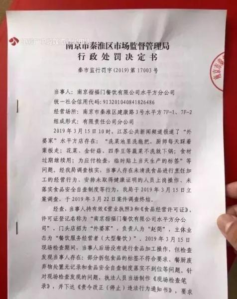 “外婆家”南京水平方店衛生亂象最新處罰結果來了!