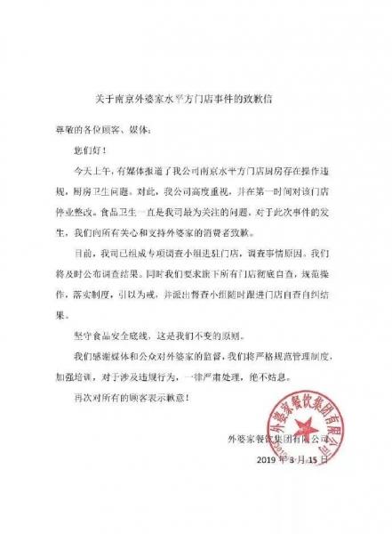此前,江蘇廣電融媒體新聞中心在3月15日“2019護航消費安全”直播中,報道了記者通過臥底調查“外婆家”餐廳,發現存在著蔬菜不洗就下鍋、不新鮮蔬菜修改生產日期繼續用、拖把在洗菜池里清洗,以及工作人員踩著案板走等多個食品衛生問題。