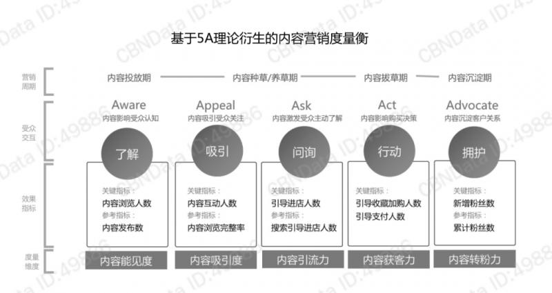 該體系以“現(xiàn)代營銷之父”菲利普·科特勒的“5A客戶行為路徑”為理論基礎(chǔ),梳理出內(nèi)容能見度、內(nèi)容吸引度、內(nèi)容引流力、內(nèi)容獲客力、內(nèi)容轉(zhuǎn)粉力共5個維度的數(shù)據(jù)指標。