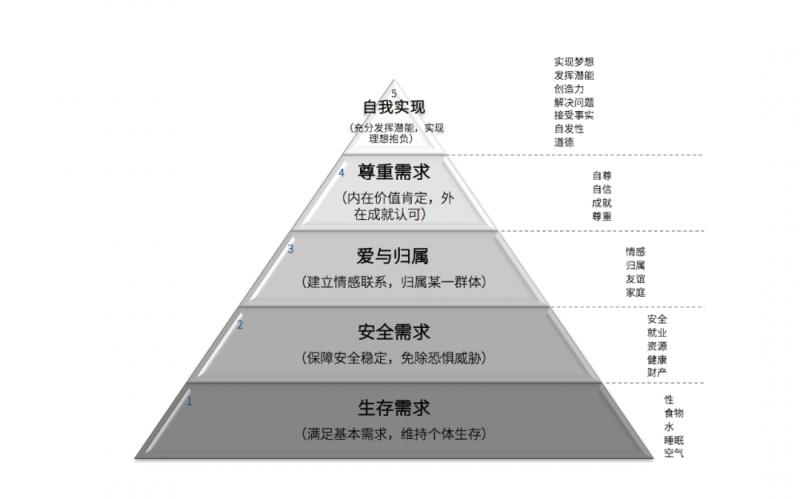 馬斯洛從人類動機的角度提出需求層次理論,該理論強調(diào)人的動機是由人的需求決定的。需求層次分為5個等級,是由低到高形成并得到滿足。而且人在每一時期,都會有一種需求占主導(dǎo)地位,而其他需求處于從屬地位。