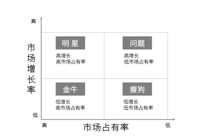 以市場占有率為橫坐標,市場增長率為縱坐標的矩陣坐標圖,將坐標圖劃為四個象限,分別為:明星產(chǎn)品、金牛產(chǎn)品、問題產(chǎn)品、瘦狗產(chǎn)品。