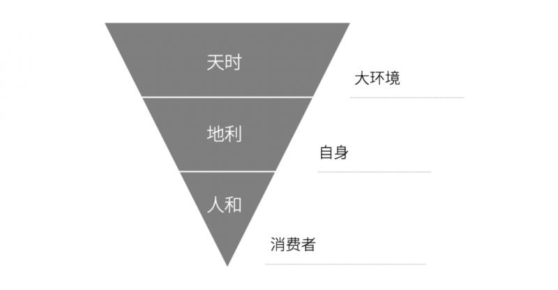 在做任何企業(yè)戰(zhàn)略時,都需要考慮天時(市場面對的大環(huán)境),不能逆天而行。地利(企業(yè)自身能力),我方是否有占據(jù)地勢優(yōu)勢。人和(消費者需求),我們做出來的產(chǎn)品是否可得人心。
