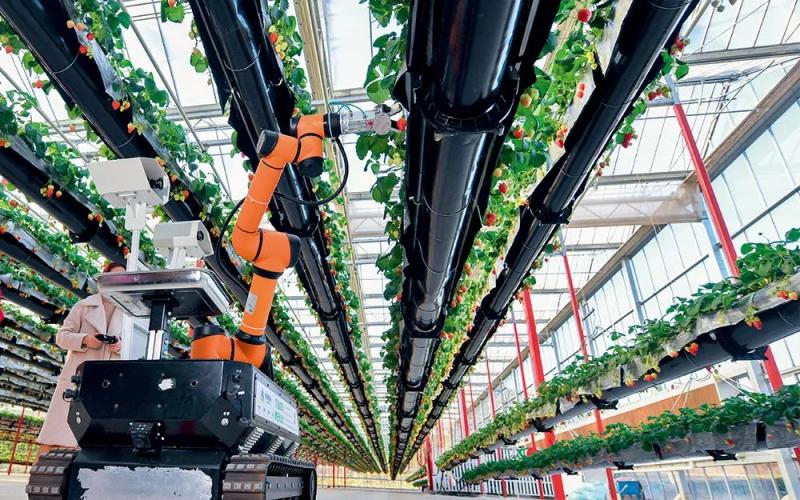 ▲ 1月9日,浙江省建德市楊村橋鎮草莓小鎮示范園區草莓大棚,新研發的草莓采摘機器人伸出機械臂,根據程序設置采摘成熟的草莓 徐昱攝