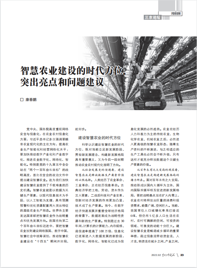 科學(xué)認(rèn)識(shí)建設(shè)智慧農(nóng)業(yè)的時(shí)代方位,既對(duì)當(dāng)前立足新發(fā)展階段、貫徹新發(fā)展理念、構(gòu)建新發(fā)展格局具有重要意義,又為今后一段時(shí)期推動(dòng)農(nóng)業(yè)農(nóng)村現(xiàn)代化指明了方向。