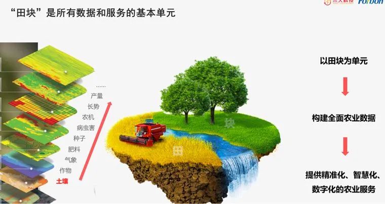那我們的觀點就是說,我們認為田塊是所有數據和服務的基本單元。剛剛我也講到了,不管是從土壤做起的一直往上的所有的這些數據都可以通過田把它創建起來,那么不同的數據可以向這個地圖的圖層一樣,一層一層的疊加起來,疊加起來是的價值是非常大的。所以我們提出就是說應該是以前塊為單元去構建全面的農業數據,然后提供這個精準化的智慧化的數字化的一個農業服務。