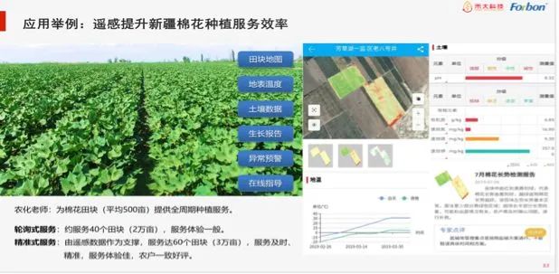 目前我們在新疆,為新疆棉花超高產(450-540公斤)項目提供衛星遙感、土壤檢測等數據采集技術,為輻射全疆的農業工作站和擁有500畝以上連片農田的農戶服務,到達棉花高產目的。已為當地農戶提供土壤檢測報告、當前棉花長勢監測報告及植被覆蓋檢測報告,及時掌握作物長勢。