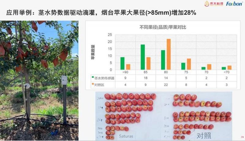 目前,我們在山東煙臺進行了試驗示范。使用莖水勢傳感器的與未使用莖水勢傳感器的對照區整體對比,示范區的果樹樹勢明顯更旺盛,樹葉大小、厚度、顏色等明顯優于對照區,掛果量更多,果實更大??傮w而言,示范區比對照區蘋果每畝平均要增產10%左右,增收20%--30%。