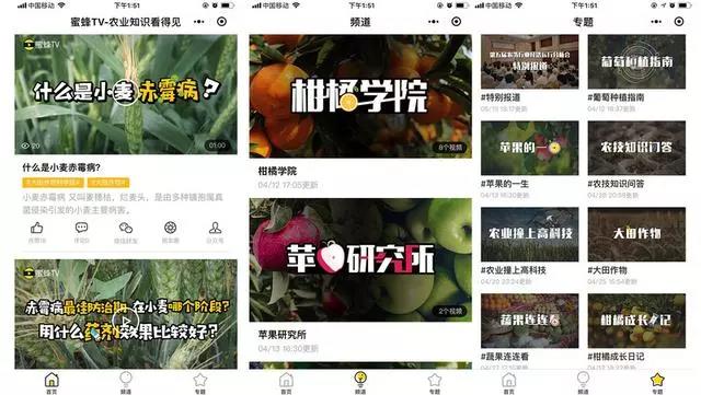 據悉,蜜蜂TV 主要面向想要學習農業知識的“新農人”。平臺目前與 200 多位農技專家合作,重點打造柑橘學院、蘋果研究所、葡萄科考隊、蜜蜂百科、大田作物科學院、蔬果科學院 6 大農業知識矩陣,聚焦農民最關心的經濟作物柑橘、葡萄、蘋果、火龍果,大田作物小麥、玉米,蔬果類辣椒等話題。