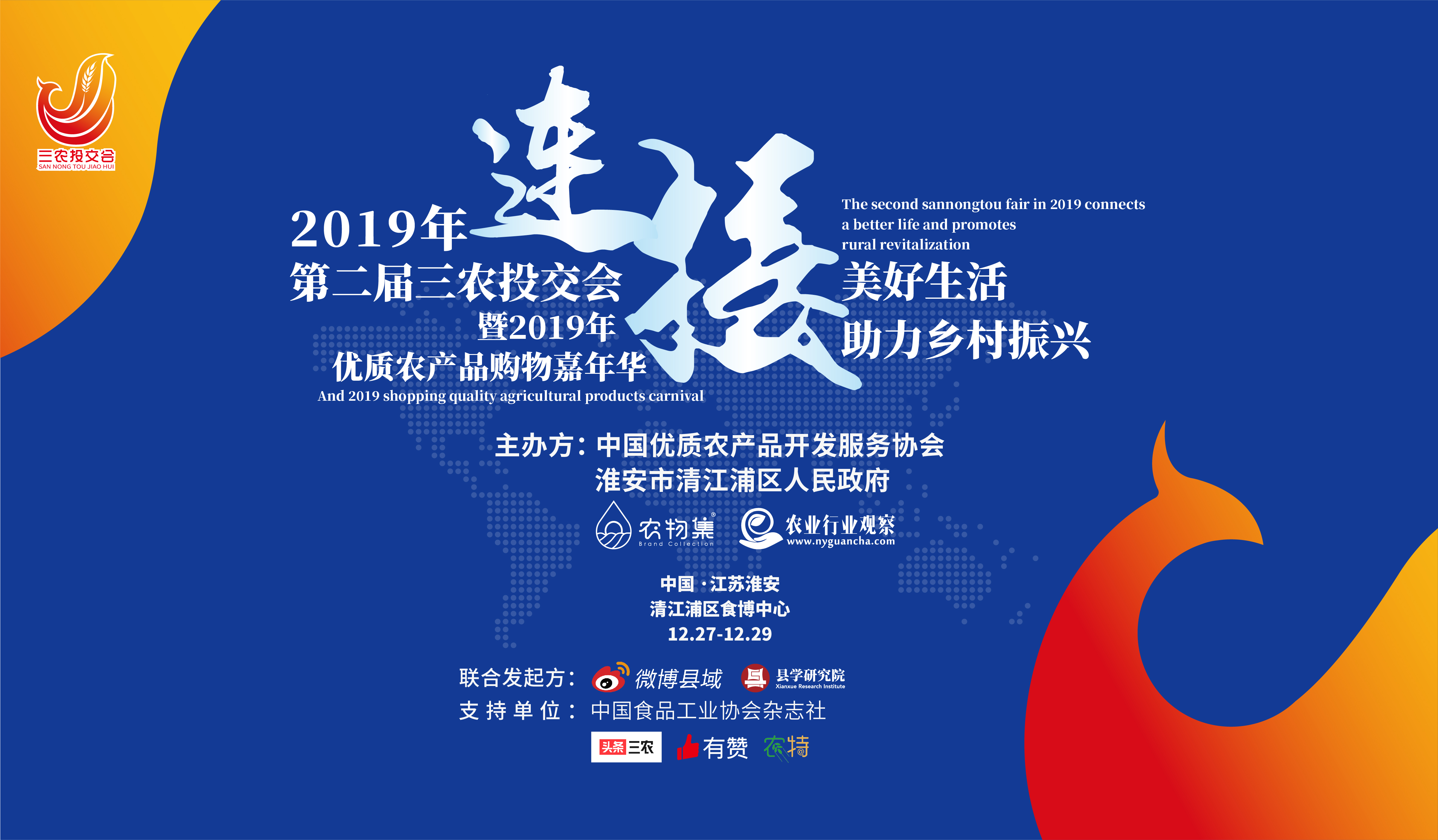 2019年12月27-30日,2019第二屆三農投交會暨農業創新創業盛典&首屆優質農產品展銷嘉年華在江蘇淮安●中國(淮安)國際食品博覽中心。本屆大會由農物集、農業行業觀察與中國優質農產品開發服務協會、淮安市清江浦區人..