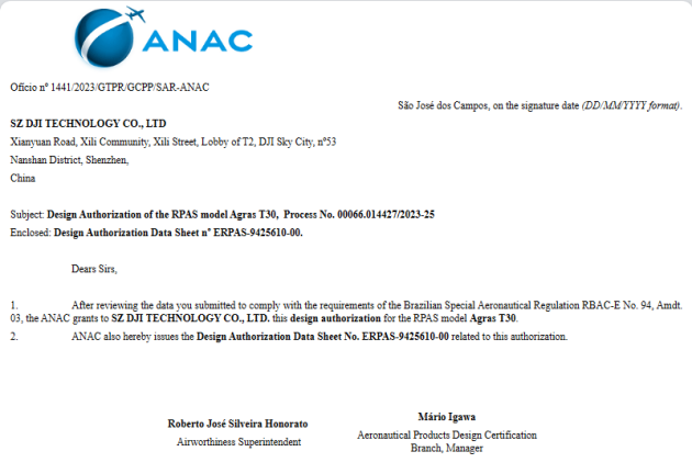 近日,大疆農業三款無人機T30、T40、T20P在巴西獲得了由巴西國家民航局(ANAC)頒發的設計授權證書。這是大疆的無人機產品在海外首次獲得適航類證書,意味著大疆農業無人機型號設計與生產在巴西受到了官方的認可。近..