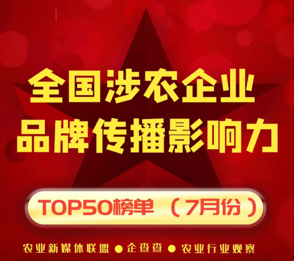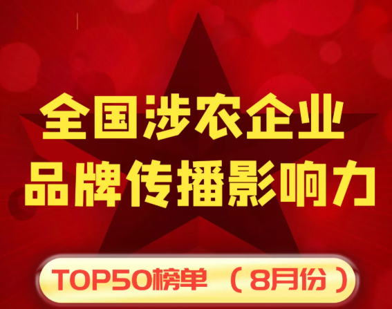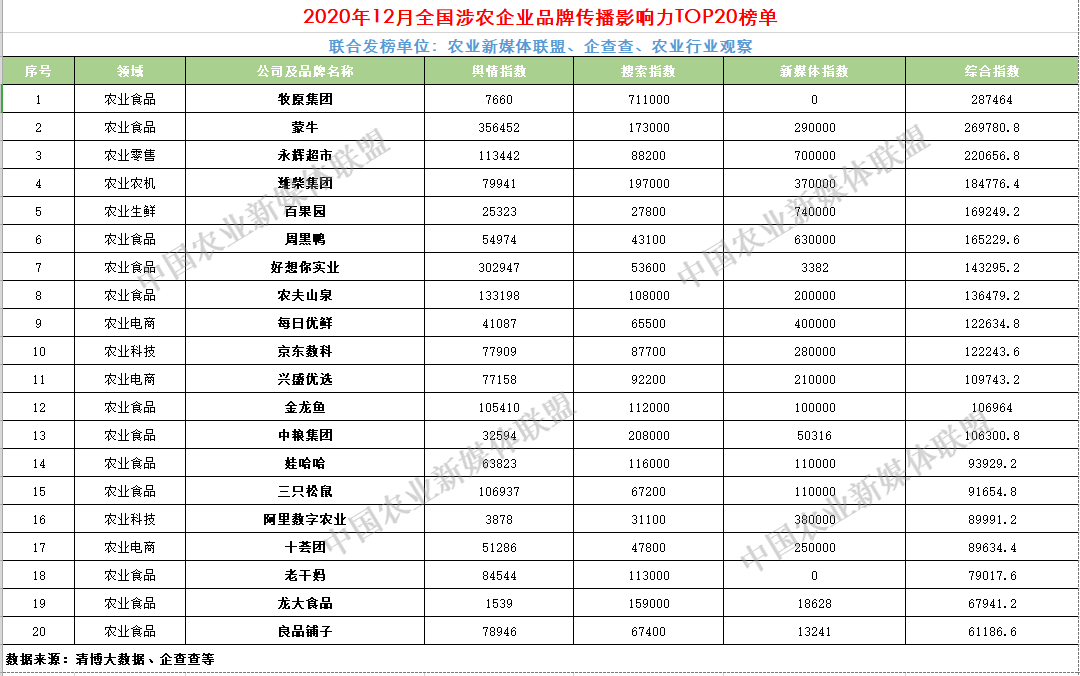 近日,由農業(yè)新媒體聯(lián)盟、企查查、農業(yè)行業(yè)觀察聯(lián)合發(fā)布的2020年12月“全國涉農企業(yè)品牌傳播影響力TOP20榜..