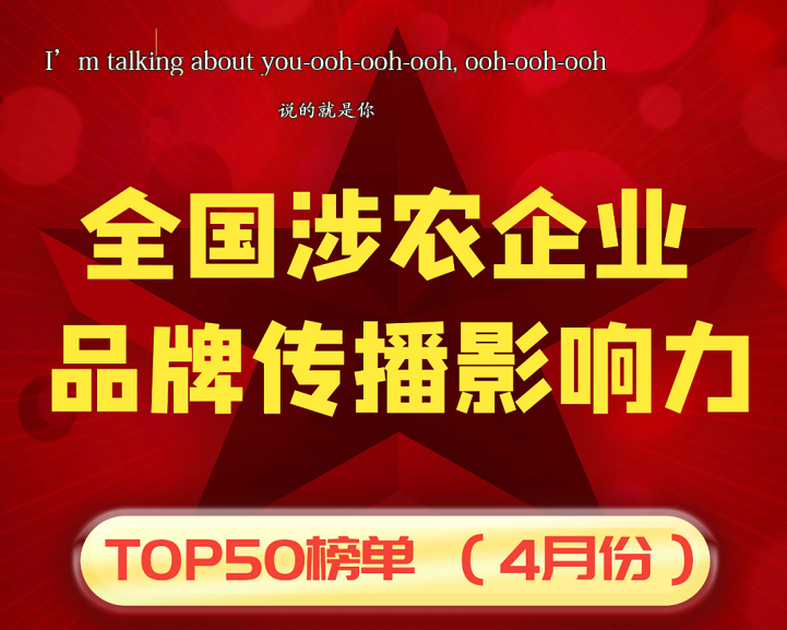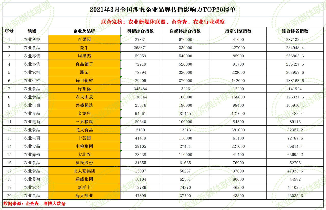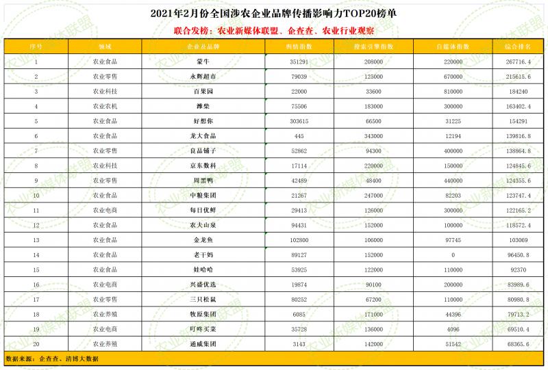 近日,由農業(yè)新媒體聯(lián)盟、企查查、農業(yè)行業(yè)觀察聯(lián)合發(fā)布的2021年2月份“全國涉農企業(yè)品牌傳播影響力TOP20”..