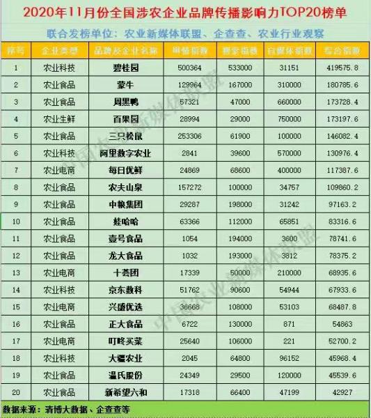 近日,2020年11月全國涉農企業(yè)品牌傳播影響力TOP20榜單新鮮出爐,碧桂園、蒙牛、周黑鴨摘得前三名;其中,..